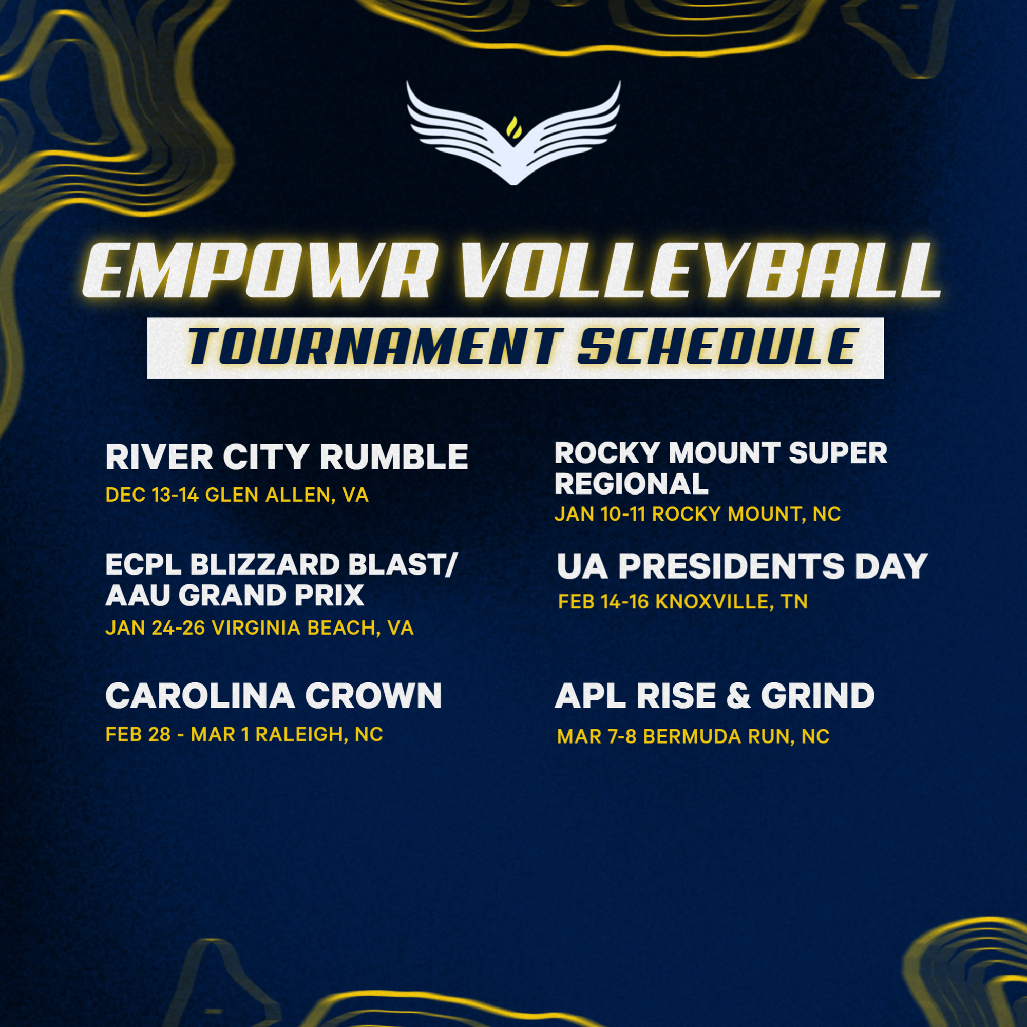 The first practice will be Monday, November 3rd and the season will go until our last tournament in March.